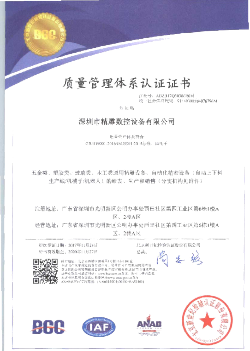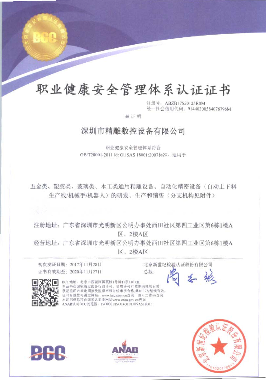 深圳市精雕數控設備有限公司,取得,職業健康安全 管理體系,環境管理體系,質量管理體系三大證書。
