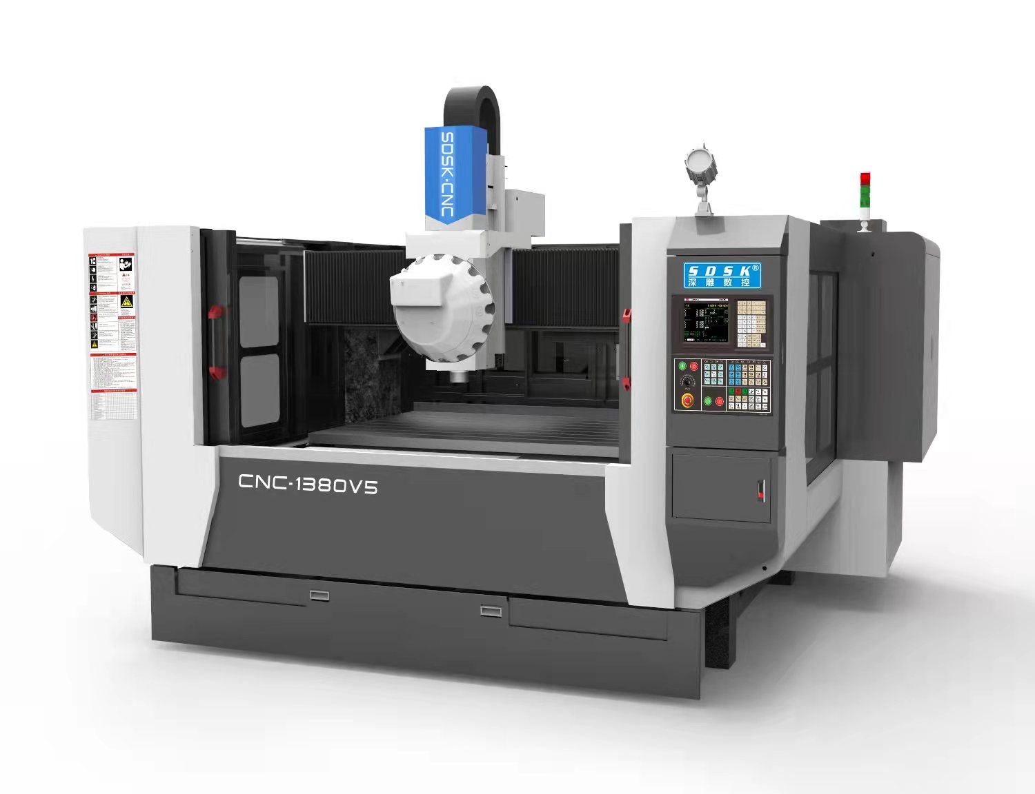 SDSK1380V5-BT30機型是專門為客戶量身定做的大型1.3米高速玻璃精雕機;定梁式結構;配有臺灣圣杰16飛碟式刀庫,換刀速度為2; 運動方式為Y軸工作臺前后移動,X軸左右移動,Z軸上下移動。 機身采用頂級的花崗巖(大理石)結構、永遠不變形;三軸采用進口臺灣上銀精密級直線導軌,臺灣TBI  研磨級滾珠絲桿,德國聯軸器,伺服電機,配電柜恒溫系統,先進的主軸制冷系統,自動潤滑系統,水循環冷卻液噴水及噴霧系統,空氣過濾裝置,保證了更高的加工精度、速度與穩定性; 特別適用于各類玻璃、石英玻璃、陶瓷、玉石、藍寶石等零件的精密磨邊、切割、打孔、拋光等加工