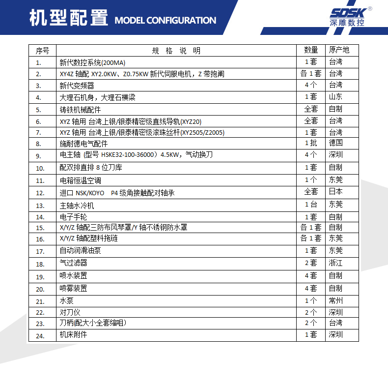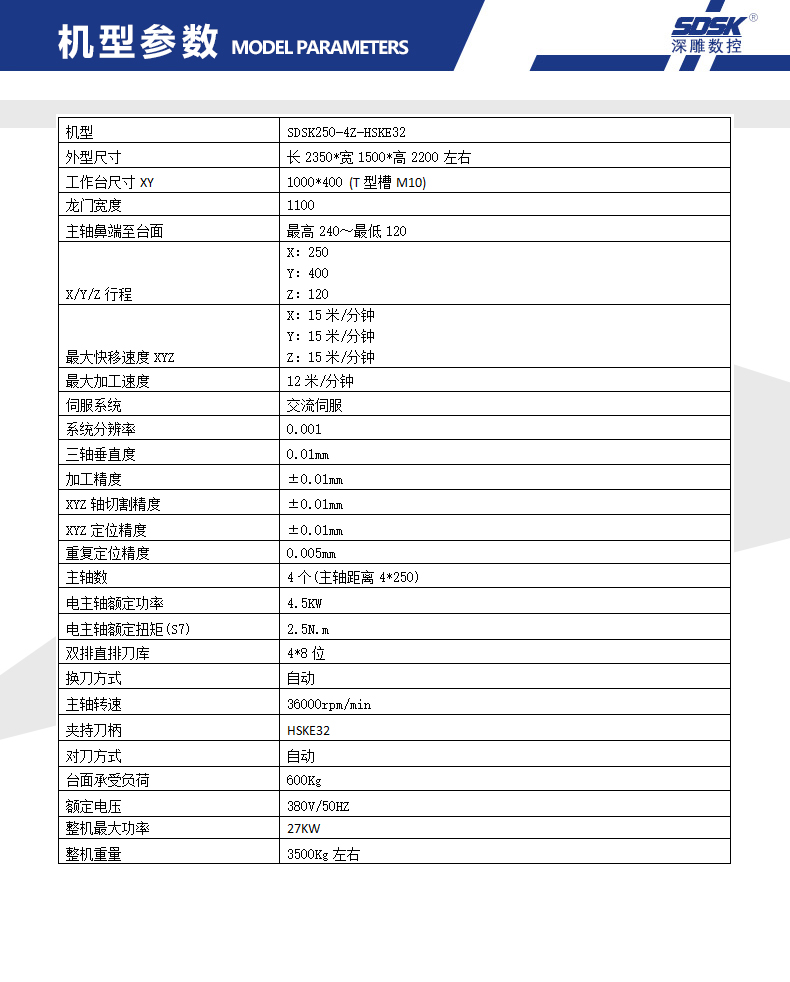 1. The SDSK250-4Z-HSKE32 model is a four head precision carving machine specially designed for customers; Equipped with dual row straight 8-position tool magazine; The movement mode is to move the Y-axis workbench forward and backward, the X-axis to move left and right, and the Z-axis to move up and down< Br/>