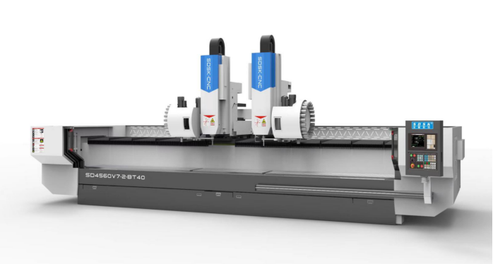 1. The SD-4500V7-2-BT40 model series is a large double head and double channel profile machining center specially designed for customers; Crown block structure; Equivalent to two machines using one set of CNC system and one set of bed; Can process two different workpieces simultaneously, can also process the same workpiece in segments with both ends, or can process two identical workpieces simultaneously; The dual Y-axis machine head moves forward and backward, and the motion mechanism is designed on the top of the crossbeam, which is lightweight, convenient, and easy to clean. It can move forward and backward simultaneously or independently. The 2X-axis machine head can move left and right simultaneously or independently, and the 2Z-axis spindle can move up and down simultaneously or independently. When processing batch products, both ends can be used simultaneously, making debugging simple and convenient. The X1 axis can also be moved to the left side of the machine to process long stroke workpieces separately using the X2 axis, achieving a dual-use function< Br/>